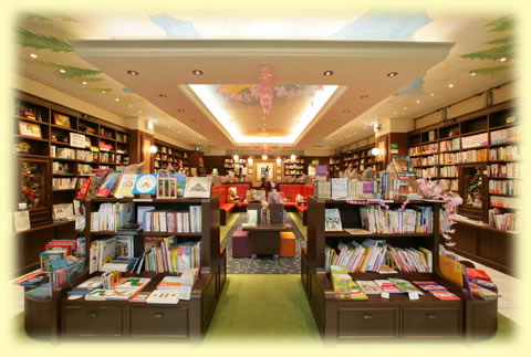 高い天井に、たくさんの本に囲まれた広い読書スペース――――。絵本の一節のようなパステル画が描かれた天井、暖かな太陽をイメージした赤いソファ、爽やかで落ち着く緑のカーペットが敷かれた床。本を選ぶ時間も大切にしてほしいと願って、店内の居心地のよさにもこだわりました。年齢、性別問わずに、いろいろな人の集う場所「ブックハウス神保町」。お気軽におこしください。そして、ゆっくりとお過ごしください。